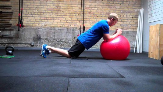 Es un movimiento que se hace cuando se está comenzando, apoyando las rodillas sobre el suelo y apoyando los antebrazos sobre la pelota, de esta forma se aumenta la estabilidad abdominal.