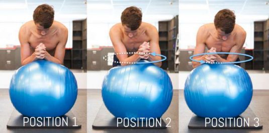 Debe ubicarse de frente a una pelota suiza, colocando las rodillas sobre el suelo, y los antebrazos sobre el balón suizo.