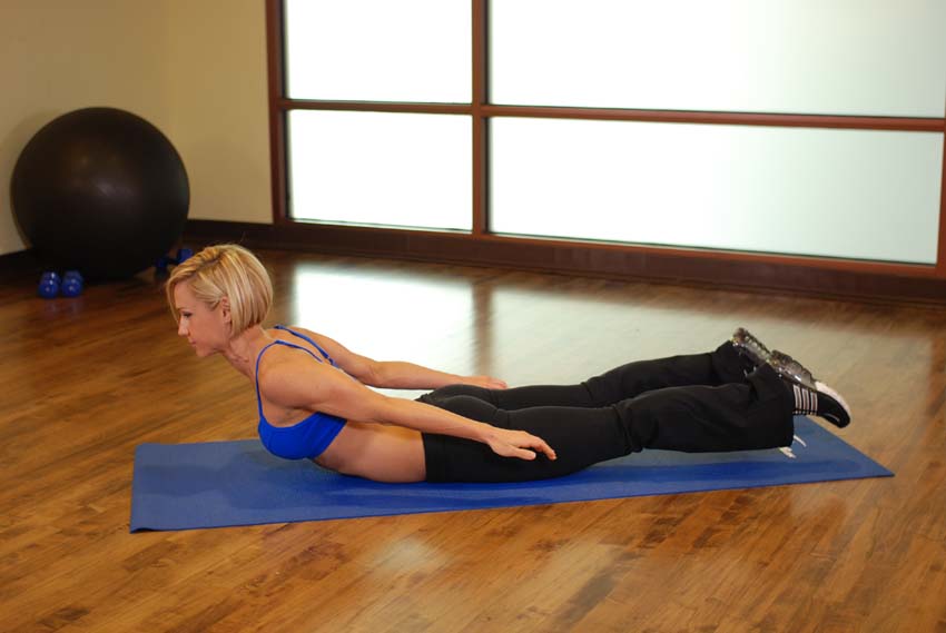 2. Usando tus músculos traseros más bajos, extiende tu columna vertebral levantando el pecho y hacia fuera del suelo. No utiliza tus brazos para empujarte hacia arriba. Mantén la cabeza en alto durante el movimiento.