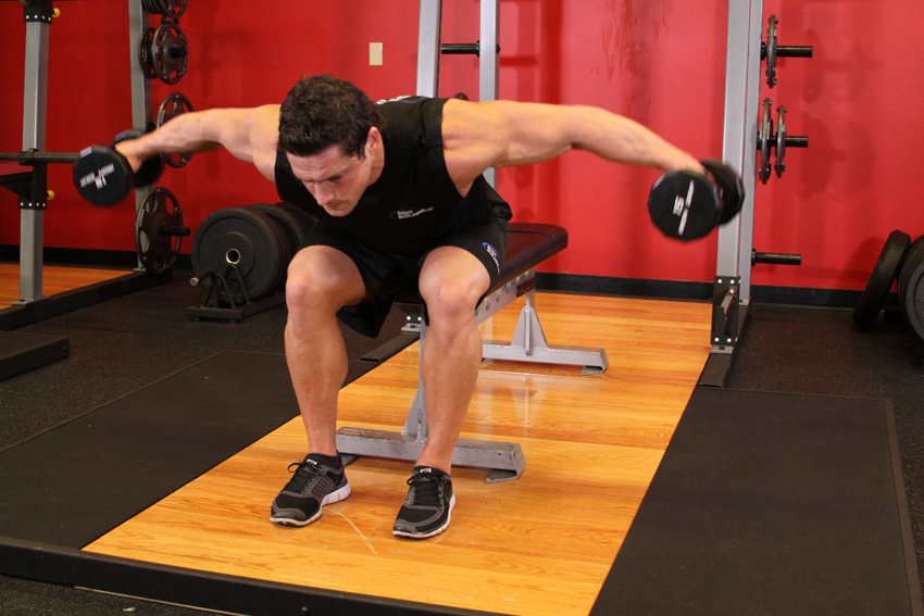 4. Manteniendo el torso hacia adelante y fijo, y los brazos ligeramente doblados por los codos, levanta las pesas directamente al lado hasta que los brazos queden paralelos al piso. Exhala al levantar las pesas. (Nota: Evita balancear el torso o llevar los brazos hacia atrás en lugar de al lado.)