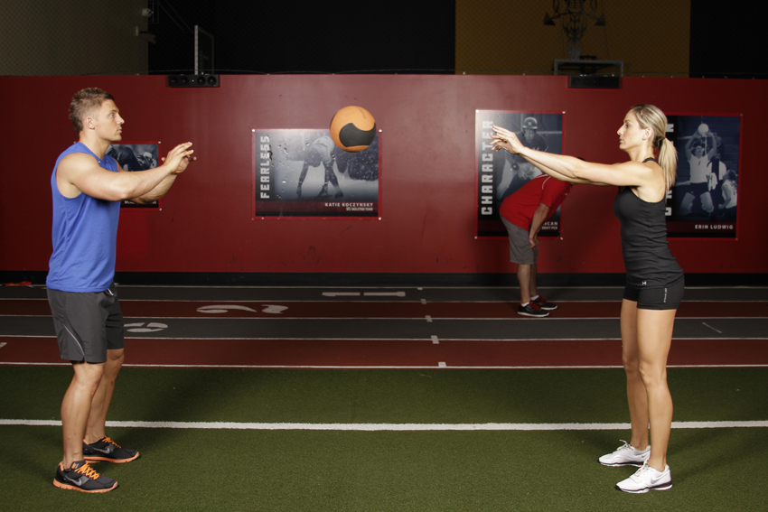 2. Comienza de cara hacia tu pareja sosteniendo el balón medicinal en el torso con las dos manos.