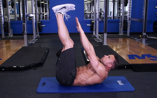 3. Abdominal completo con intercambio de pierna: 15 repeticiones para cada una de las piernas.